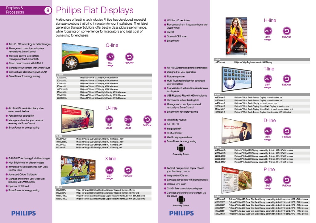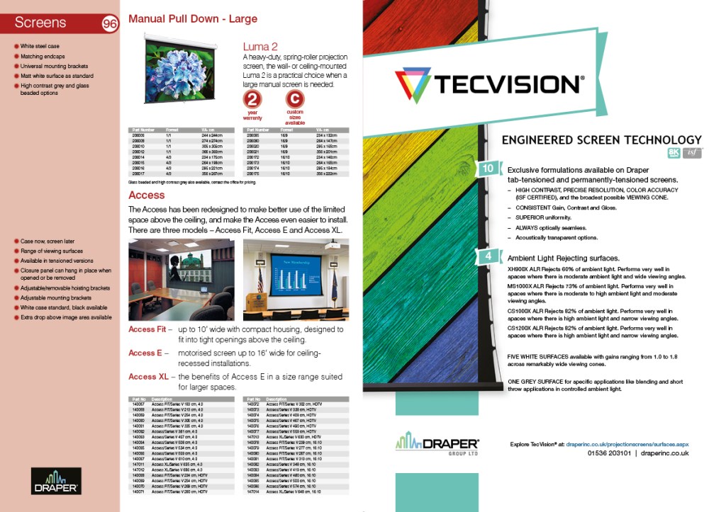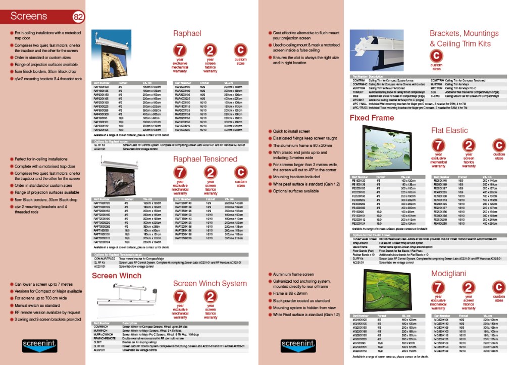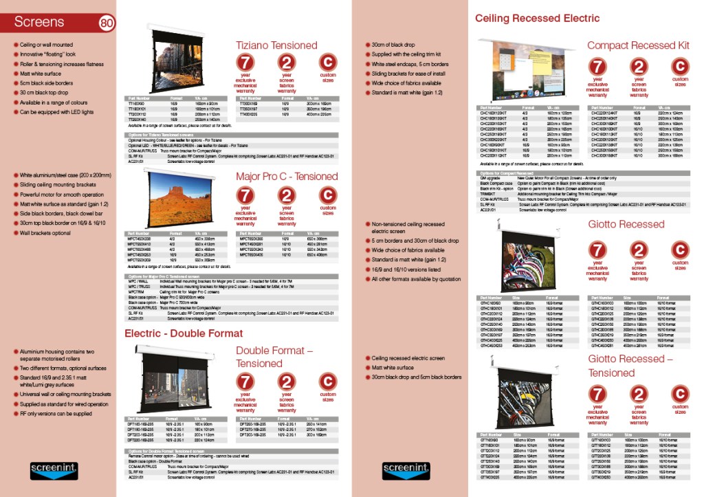 Over the years, the catalogue evolved through various design templates, but for this issue I went for a three column grid with technical spec and logos on the left-hand coloured column. This allowed for colour coding of the sections, and was versatile enough to accommodate the variation in the type and number of items on each page. The images were from a multitude of manufacturers, so there were a lot of variations in style. For consistency, we decided they should be cutouts wherever possible, and that colourful pictures be added to screens to add vibrancy.